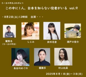ろーまの平日ぷれぜんつ この中に1人、台本を知らない役者がいるvol.9 8/1(金)15時 8/2(土)12時